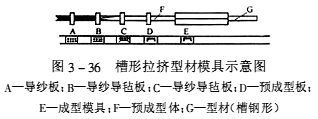 ![]() (4)槽形型材成型模具 槽形拉擠型材的增強(qiáng)材料配置形式一般用氈、紗、氈形式,其模具組合形式如圖3-36所示。