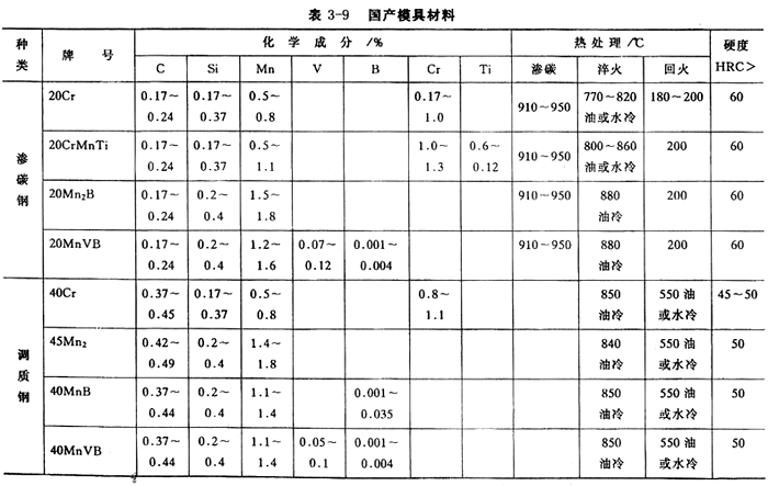 (3)模具材料 應(yīng)能滿(mǎn)足以下要求:強(qiáng)度高,熱處理變形小,加工性能好,易拋光,耐磨、耐熱及耐熱腐蝕等。完全都能滿(mǎn)足這些要求的材料為數(shù)不多,價(jià)格昂貴。設(shè)計(jì)模具時(shí)應(yīng)按其主要要求考慮。國(guó)產(chǎn)模具材料見(jiàn)表3-9。