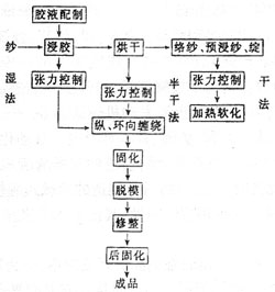 (1)纖維纏繞成型工藝及分類 根據(jù)纖維纏繞成型時(shí)樹(shù)脂基體的物理化學(xué)狀態(tài)不同,分為干法纏繞、濕法纏繞和半干法纏繞三種,其工藝流程如下: