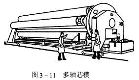 大于800mm直徑的管芯模,采用開(kāi)縮式芯模如圖3-10所示,芯模殼體由經(jīng)過(guò)酸洗的優(yōu)質(zhì)鋼板卷成,表面經(jīng)過(guò)拋光、打磨,具有高精度和高光潔度。芯模中心軸,沿軸長(zhǎng)度方向,每隔一定距離有一組可伸縮式輻條機(jī)構(gòu)支撐的輪狀環(huán),用于支撐芯模外殼。脫模時(shí),通過(guò)液壓機(jī)械裝置,使芯模收縮從固化制品中脫下來(lái)。再用時(shí),將芯?;謴?fù)到原始尺寸。為了提高生產(chǎn)效率,減少纏繞過(guò)程中裝、卸管芯模的時(shí)間,在纏管機(jī)上增設(shè)多軸芯模裝置(見(jiàn)圖3-11),它是一個(gè)圓盤(pán)回轉(zhuǎn)架,架上可同時(shí)裝3~6根相同或不同直徑的芯模?;剞D(zhuǎn)架使每根芯模依次置于纏繞工位進(jìn)行纏繞,在回轉(zhuǎn)架底座旁邊有一個(gè)液壓動(dòng)力升降機(jī),將纏好的管正確的放在脫模機(jī)上脫模。這種裝置能提高生產(chǎn)率3~6倍。