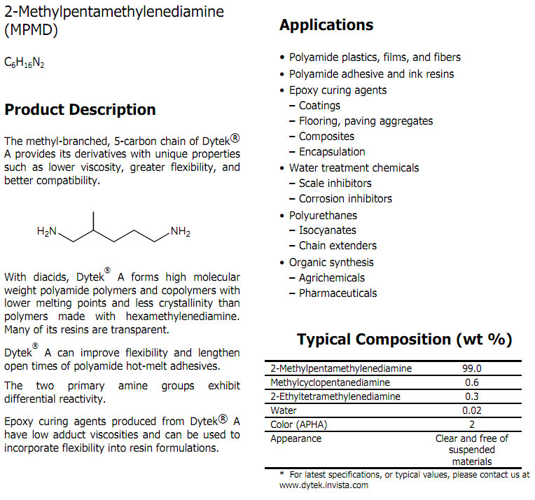 The methyl-branched, 5-carbon chain of Dytek® A provides its derivatives with unique properties such as lower viscosity, greater flexibility, and better compatibility.